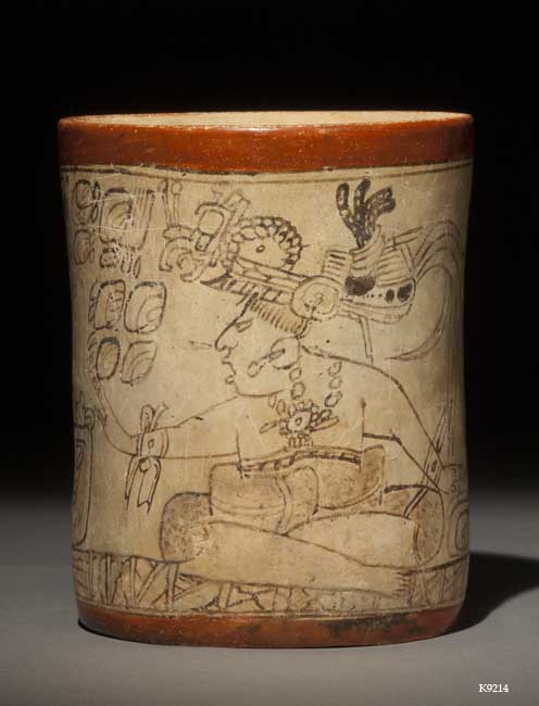 Kerr Number: 9214 | Vase Type: Codex Style | Figure Count: 0 | Height: 15 cm | Diameter: 12 cm | Circumference: 37 cm | MS Number: | Owner: | School: | Publications: | Calender Round: | Site: | Comments: CLICK for the shape of the vessel | Iconographic Elements: Throne, Ah K'hun, orator, Ruler, king, cacique, governor, potentate | |