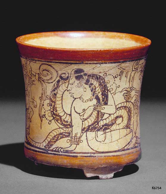 | Kerr Number: 6560 | | Vase Type: Molded | | Figure Count: 6 | | Height: 19.5 cm | | Diameter: 9 cm | | Circumference: 40 cm | | MS Number: | | Owner: | | School: | | Publications: The maya Vase Book, Volume 6 P. 974 | | Calender Round: | | Site: | | Comments: Pedestal vase, orange, two scenes of ruler seated on monster head throne facing God K with God D behind. | | Iconographic Elements: God D, Itzamnah, God K, Kawil, Ruler, king, cacique, governor, potentate, Sky band with star glyphs, Throne | |
