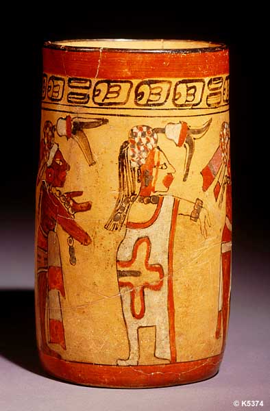 | Kerr Number: 5371 | | Vase Type: Polychrome | | Figure Count: 4 | | Height: 20 cm | | Diameter: 11 cm | | Circumference: 34 cm | | MS Number: 1159 | | Owner: Mint Museum of Art Charlotte NC | | School: | | Publications: | | Calender Round: | | Site: | | Comments: Museum number 81.201.16 | | Iconographic Elements: Dwarf, Inscription - other text, Ruler, king, cacique, governor, potentate, Trophy head | |
